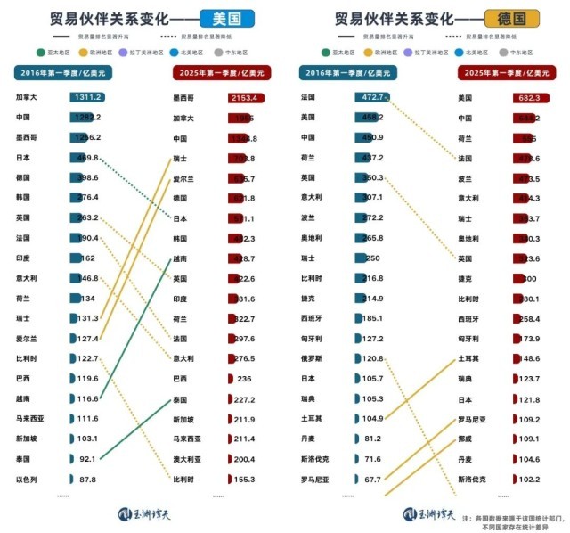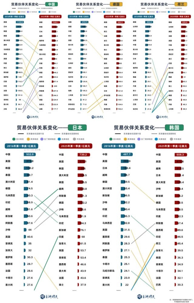 中国特别凸起。一方面,亚太国度逐步正在中国商业伙伴中占领从导地位。中国前十大商业伙伴中,一半以上是亚太国度,包罗韩国、日本、越南、马来西亚、印尼和印度等。另一方面,除了深化亚太区域经济合做,中国还取拉丁美洲、中东等地域的国度成立了愈加慎密的联系。相关地域国度正在中国商业伙伴排名中的大幅上升。比拟于美欧的区域集中,跨区域多元有一个特点是,相关国度不只参取出产环节,也参取高附加值环节(如研发、手艺尺度制定)。这个数据背后,中国不只无效分离了市场风险(这正在中国寻求美国农产物进口替代中有所表现),通过参取拉美国度的根本设备扶植、中国帮帮拉美国度提拔其经济附加值的同时,两边正在价值链上的也正在配合提拔。全球商业款式正处于一个环节的转机点。美国关税政策的朝四暮三虽然制制了不确定性,但也促使全球商业系统加快向实正多元的标的目的成长。通过数据阐发,我们能够看到,虽然美国仍是全球商业的主要参取者,但其影响力正正在逐步削弱。成长中国度和新兴经济体,出格是亚洲、拉丁美洲和中东地域,正成为全球商业新的增加点。多元化的商业合做以及国际关系关系的沉构,都表白全球商业系统正正在顺应新的挑和,并朝着更有韧性和包涵性的标的目的成长。