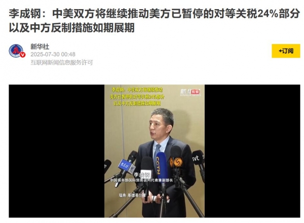 按照中国商务部国际商业代表团的最新动静,李成钢暗示:中美经贸团队将继续连结亲近沟通,就经贸问题进行及时交换。李成钢副部长暗示:两边将继续鞭策美方已暂停的24%对等关税,以及中方反制办法的展期。